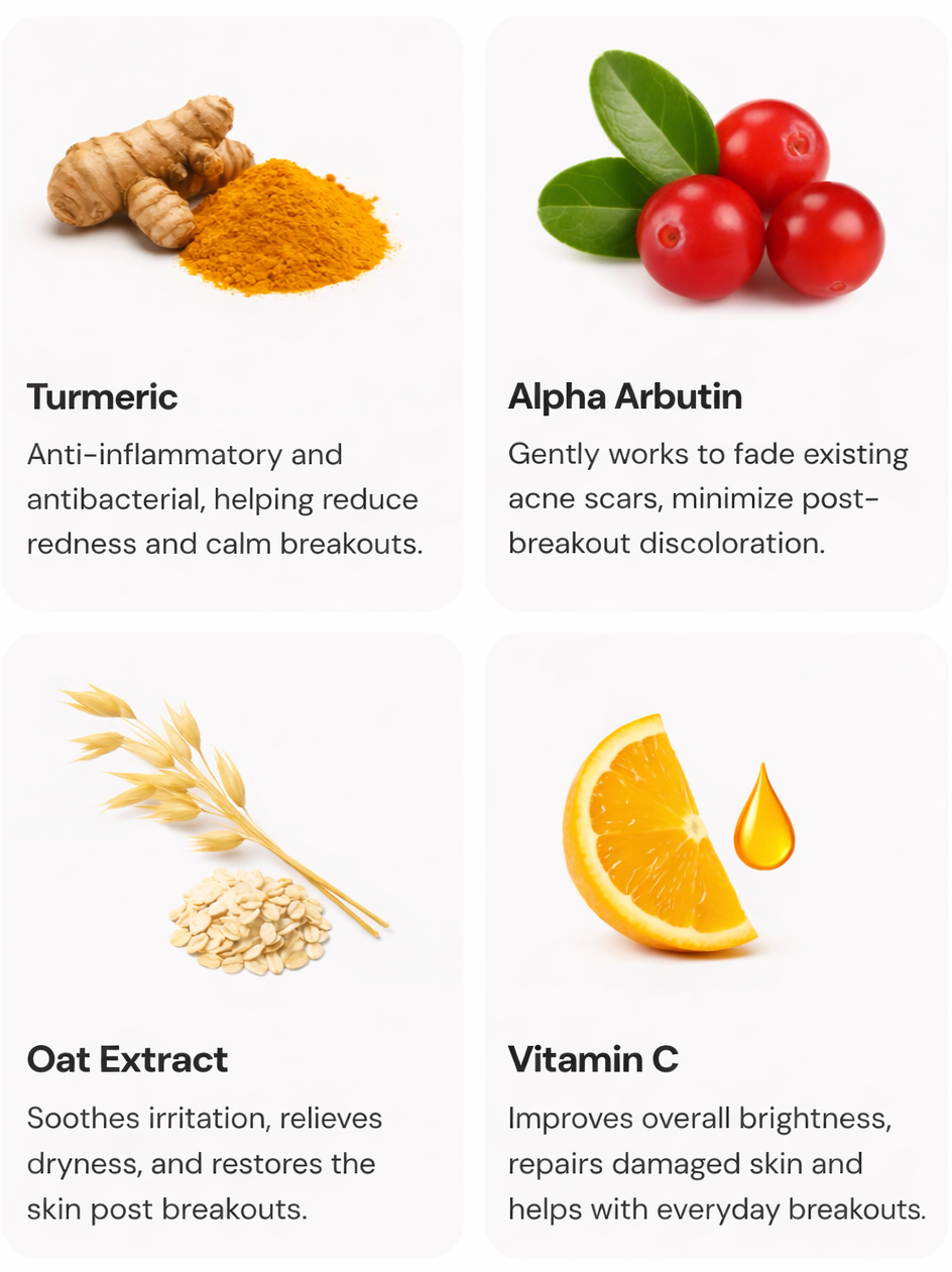 A gentle yet effective brightening agent that targets uneven skin tone and helps minimize discoloration caused by frequent breakouts.